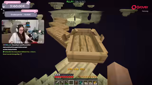 12:59:31Nach der großen Spende konzentriert sich der Streamer auf das Finden eines Outposts im Minecraft-End. Er ist nach fünf Stunden erfolgloser Suche frustriert und demotiviert, wird aber durch eine weitere Spende von Nabi mit 35,35 Euro wieder motiviert. Er erklärt den Plan, nun ins End zu gehen, um eine Elytra zu finden, und betont, dass die Challenge fast beendet ist, da der Gegenstand nur noch eine Weile entfernt scheint.