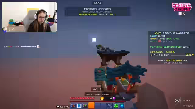 01:22:00Felika muss feststellen, dass nicht genug Spieler für eine volle Lobby im Minecraft-Server vorhanden sind, was das Training schwierig macht. Sie gibt die Server-IP play.mccisland.net aus und bittet die Zuschauer, mitzumachen, damit die Runden voller werden. Es wird erneut das bevorstehende Turnier, die Magenta E-Trophy MCC Edition, angekündigt. Felika erklärt, dass sie an diesem Turnier teilnimmt und aktuell übt. Sie ist im Trainingsmodus und möchte unbedingt den ersten Platz machen, um Ruhm und Ehre zu erlangen. Ihr Selbstvertrauen ist hoch, doch sie weiß, dass der Druck im Turnier ein anderer sein wird.