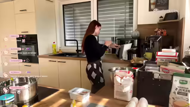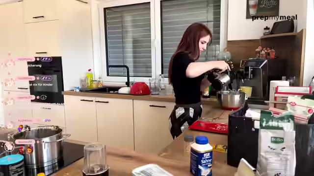 04:02:56Die Streamerin äußert Bedenken bezüglich der Lautstärke des Mixers und bittet die Zuschauer, ihre Lautstärke anzupassen. Sie hat Verbindungsprobleme mit Twitch und startet ihr Handy neu, um das Problem zu beheben. Sie gibt die restlichen Zutaten wie Gewürze, Vanilleextrakt und Salz in den Topf. Sie verwendet normalen Joghurt anstelle von griechischem Joghurt und bereitet 180 Gramm Mehl vor. Die Streamerin überlegt, was sie zum Abendessen essen soll und entscheidet sich für einen Wurstsalat. Sie fügt Mehl und Backpulver hinzu und sucht nach der richtigen Menge Natron. Sie stellt fest, dass im Rezept keine Mengenangabe für Natron steht und fragt sich, ob ein Fehler vorliegt. Sie stellt fest, dass Natron und Baking Soda das Gleiche sind und fügt eine kleine Menge hinzu. Essig und Joghurt werden hinzugefügt und alles gut verrührt. Zum Schluss kommen Mehl und Backpulver hinzu.