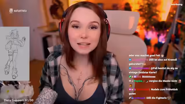 00:01:08Der Stream startet mit einem lockeren Gespräch und persönlichen Einblicken. Im Fokus steht ein großes Community-Projekt: ein gemeinsames Artwork. Streamer feli kündigt an, dass ihre Community als Pokémon gezeichnet wird. Dafür startet sie eine Aktion bei der Nasalock. Teilnehmer können sich für 10 gesponsorte Subs, 30 Euro oder 3000 Bits als Pokémon im Bild verewigen lassen. Die Künstlerin Arainuki zeichnet das Projekt sogar live auf Twitch.