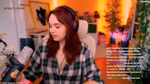 Es wurde ein Stream gestartet, der von gesundheitlichen Beeinträchtigungen geprägt war. Die Streamerin berichtete über starke Schmerzen am großen Zeh, die sie mit einer Tapespange behandelt. Parallel dazu wurden tiefgründige Themen behandelt. Es wurde offen über die Sorgen im Zusammenhang mit Haarausfall gesprochen und gesellschaftliche Kritik an der unethischen Werbung von Influencern für Fastfood-Ketten geäußert.