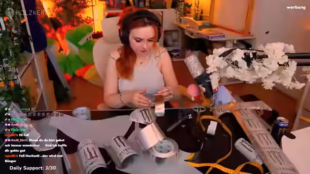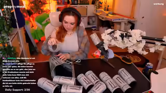 00:21:12Die Streamer zeigt ein Paket mit circa 60 ausgeschnittenen weißen Monsterdosen, die von einem langjährigen Zuschauer für ihr Cosplay-Projekt gespendet wurden. Sie erklärt, dass die Dosen alle selbst getrunken und ausgeschnitten wurden und dankt dem Spender. Die Streamer plant weiter am White Knight Cosplay und benötigt noch zusätzliche Materialien wie eine Brustpanzerung und ein Korsett. Sie zeigt die bereits fertiggestellten Teile und diskutiert den Fortschritt des Projekts.