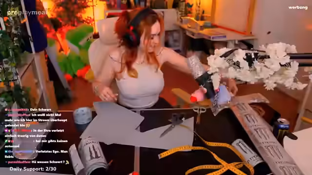 03:04:10Die Streamerin arbeitet an der Kreation eines weißen Monster-Wappenrocks. Sie hat sich bereits Gedanken über die Gestaltung der Schlitze an der Seite gemacht und es wird deutlich, dass sie eine freudige aber chaotische Arbeitsweise beim Nähen hat. Sie äußert Bedenken bezüglich der Stabilität ihres Klapptisches, der beim Nähen stark schwanken könnte. Ihre Nähfähigkeiten beschreibt sie als aus der Kindheit stammend, obwohl sie zuerst Schwierigkeiten hatte und alles nach einem Traum gelernt hat, in dem ihr Schnittmuster und Nähen erklärt wurden.