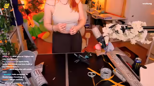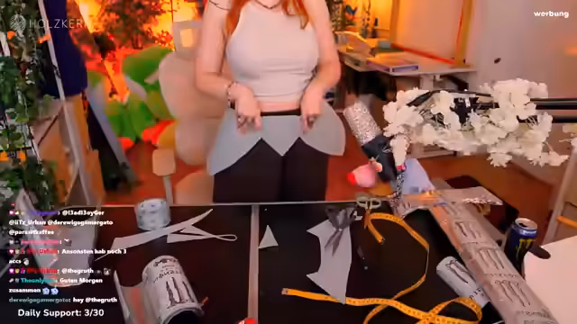 04:25:27Die Streamerin arbeitet an einem weißen Monster-Cosplay, wobei sie besonders auf den Schnitt und das Design des Rocks konzentriert ist. Sie testet verschiedene Längen und Designs, wobei sie für mehr 'sexy' Ausstrahlung sorgt. Das Projekt wird als 'Sexy badass Ritter' konzipiert und sie ist bestrebt, ihre eigene Vision umzusetzen, auch wenn es Vorschläge aus der Community gibt. Sie diskutiert auch Materialien wie Applikationsfolie und Metallfarbe für das Monster-Symbol.