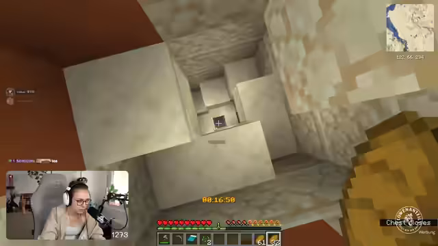 01:47:11Die Spieler erkunden die Wüste und stoßen auf eine teilweise vergrabene Pyramide mit wertvollen Gegenständen und Fallen. Sie durchsuchen vorsichtig die Struktur, werden aber mehrfach von TNT-Fallen überrascht. Trotz der Gefahren finden sie viele nützliche Items wie Gold, Eisen, Smaragde und einen Sattel, der es ihnen ermöglicht, gemeinsam auf einem Kamel zu reiten.
