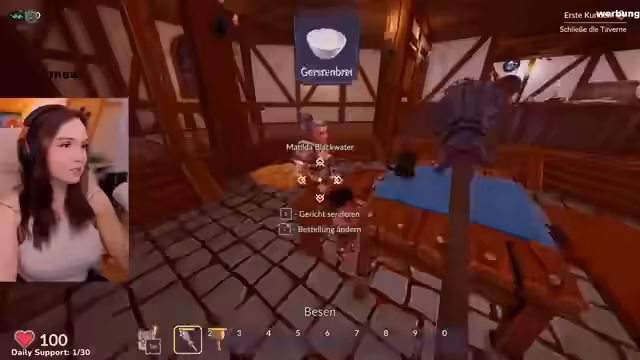 05:32:40Finanzsorgen prägen den Stream: Der Hühnerstall kostet 5000 Gold, doch Einnahmen aus Muffins (115 Gulden pro Stück) und Gerstenbrei sind begrenzt. Feli plant Investitionen in einen Aufräumhelfer (1800 Gold), um Produktion und Verkauf zu optimieren. Trotz verbesserter Erträge durch Dünger bleibt das Gold knapp, und die Taverne kämpft mit schwankendem Gästeflow und Lieferengpässen.