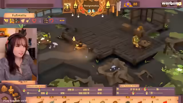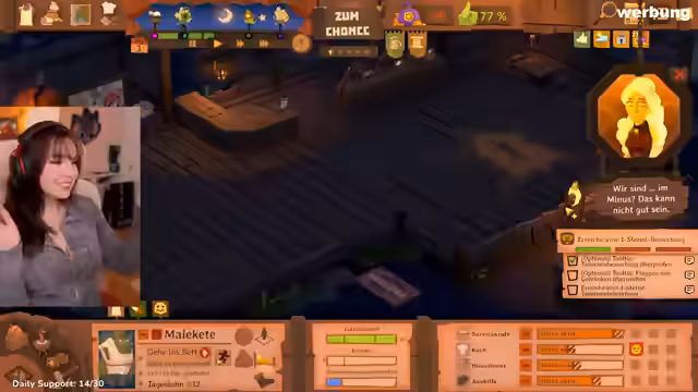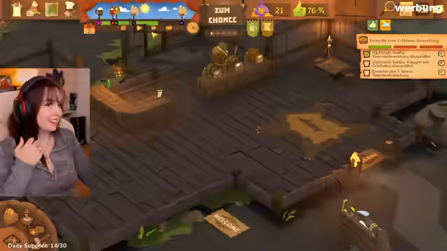02:55:16Feli startet mit der Erstellung der Taverne in 'Tavern Keeper'. Sie wählt den Standort Flussgrund, lässt das Tutorial laufen und entscheidet sich für deutsche Steuereinstellungen (mit einem anfänglichen Steuersatz von 19%). Sie baut eine Schankstube, platziert eine Bartheke und stellt Personal ein – darunter den Charakter Raymond als Servicekraft. Nach dem Kauf von Getränken wie 'Druidenfuß' und 'Gunters Blutrock' dekoriert sie den Tisch mit Gegenständen wie einer Axt und einer Teekanne. Sie nutzt das Design-Modus, um Elemente hinzuzufügen, und speichert den Spielstand regelmäßig.