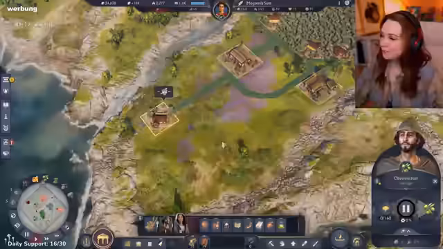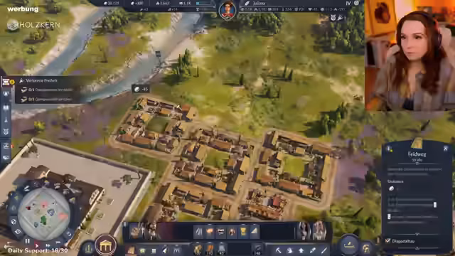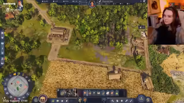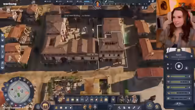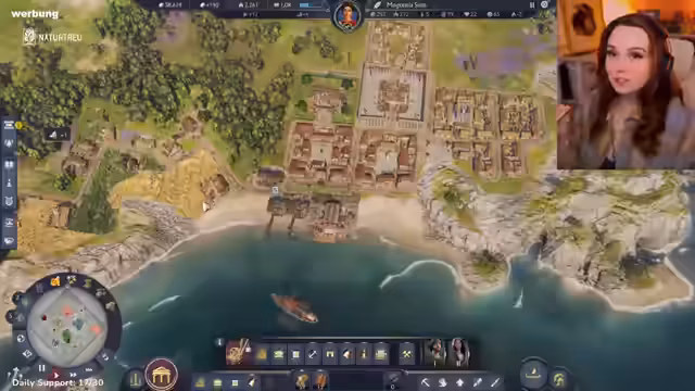 05:17:57Die Streamerin setzt das Spiel Anno Pax Romana fort und konzentriert sich auf den Ausbau der Olivenproduktion auf einer neu besiedelten Insel. Ziel ist es, genügend Oliven und Harz zu produzieren, um die Zivilisation auf höhere Stufen zu bringen. Es wird festgestellt, dass vier Olivenfarmen benötigt werden, was als 'wild' und 'krank' bezeichnet wird. Die Streamerin plant den Bau der Farmen und die damit verbundenen Wege und Häuser für die 'Plebs', die als Arbeitskräfte dienen sollen. Sie legt Wert auf ein ästhetisches Stadtbild, auch wenn es sich um Produktionsstätten handelt, und versucht, die Felder so zu platzieren, dass sie effizient sind. Es wird auch eine Olivenpresse in der Nähe des Lagerhauses gebaut. Die Streamerin diskutiert die Notwendigkeit, noch mehr Olivenöl zu produzieren, um es exportieren zu können, und plant, weitere Olivenöl-Plantagen und eine zusätzliche Presse zu errichten. Die Zuschauer werden ermutigt, sich am 'Backseat-Gaming' zu beteiligen und Tipps zu geben, falls etwas übersehen wird. Die Streamerin passt die Einstellungen an und bemerkt technische Probleme mit der Alertbox, bedankt sich aber für die Unterstützung der Community.