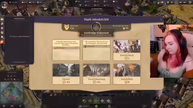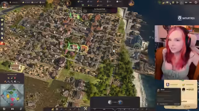 06:08:22Es wird überlegt, was ins Rathaus reingepackt werden kann. Es wird überlegt, ob ein Reparaturkran benötigt wird, da es den Schiffen gut geht. Es werden Nähmaschinen benötigt. Die Streamerin wartet auf die Rückkehr der Expedition und skippt die Zeit vorwärts. Es wird versucht, die Attraktivität der Insel zu steigern, indem Parks gebaut werden. Es wird überlegt, ein Zoo und ein Museum zu bauen, aber erst, wenn in der neuen Welt gesiedelt wurde. Die Expedition wird ausgeraubt. Es wird überlegt, ob ein Ententeich in die Stadt passt. Die Moral sinkt bei Ereignissen, damit die Reise irgendwann zu Ende kommt. Es werden weitere Ententeiche gebaut, aber die Ansehnlichkeit steigt nicht.