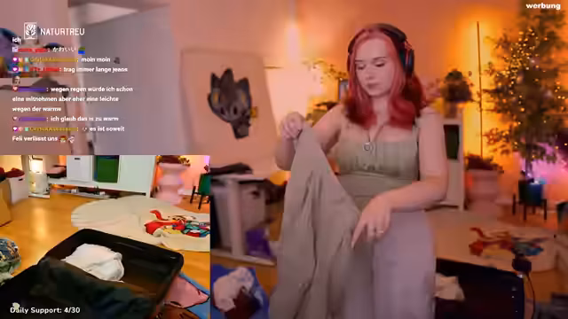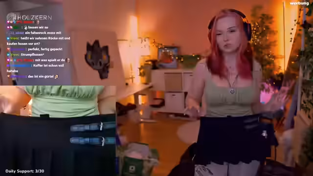 02:14:47Es wird überlegt, ob ein weißes Überzieherkchen mitgenommen werden soll. Ein langes grünes Kleid wird als zu schlicht und körperbetont für Japan eingeschätzt. Eine weiße Bluse, die in Japan gekauft wurde, soll mitgenommen werden, um sie unter Korsetts zu tragen. Eine rote Corsage wird für ein Fotoshooting eingepackt. Ein Wickelrock mit Neckholder-Oberteil wird aufgrund der Farbe, die möglicherweise nicht mehr zu den Haaren passt, in Frage gestellt. Ein weiteres Neckholder-Oberteil wird als passend für die grüne und braune Hose eingepackt. Eine cool gefundene Hose aus dem Zwift-Store passt leider nicht ganz und müsste geändert werden. Es wird überlegt, ob noch Zeit dafür ist. Eine Apfeltasche wird gegessen. Ein langärmeliges Kleid mit Schnürungen vorne und hinten wird als letztes Teil eingepackt, da es sowohl dünn als auch langärmlig ist und gut mit Boots und Strumpfhose kombiniert werden kann. Ein Backup-Pulli wird nicht eingepackt, da Pullis in Japan gekauft werden sollen. Kurze Hosen bleiben auch zu Hause. Die gepackten Outfits werden noch einmal durchgegangen, um sicherzustellen, dass genügend vorhanden sind. Es wird festgestellt, dass nur eine Kofferhälfte mit Outfits gefüllt ist, was ungewöhnlich wenig ist. Der Plan ist, in Japan Sachen zu kaufen, da die Streamerin sich allein nicht entscheiden kann, was sie mitnehmen soll.