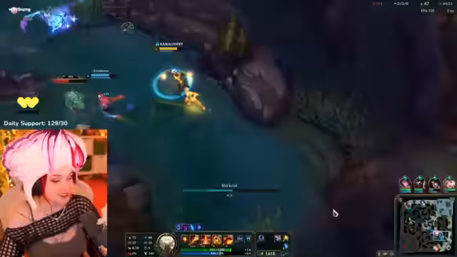 03:10:56Die Streamerin scherzt darüber, von Ringfit bezahlt werden zu müssen, da sie viele Leute dazu gebracht hat, das Spiel zu spielen. Sie bezeichnet sich selbst als Trendsetterin. Im Spiel konzentriert sie sich darauf, ihren ADC zu unterstützen und geht zurück zur Basis, um ihre Ausrüstung zu verbessern. Sie äußert sich positiv über ihre Playlist und freut sich, dass Zuschauer wieder reinschauen. Das Spiel läuft bisher nicht gut für ihr Team, aber sie ist zuversichtlich, es noch zu drehen. Es wird vereinbart, dass sie beide keine Kills bekommen sollen, um das Spiel nicht zu gefährden. Die Miss Fortune im gegnerischen Team setzt ihre Ulti zufällig ein, was die Streamerin gelassen hinnimmt. Sie plant, aggressiver zu spielen, sobald die Lux im gegnerischen Team ihre Fähigkeiten eingesetzt hat.