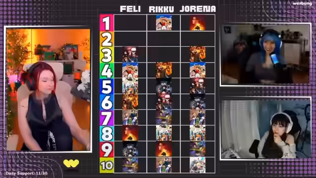 03:23:01Das Blind-Ranking beginnt mit dem Thema Anime. Die erste Nominierung ist Jujutsu Kaisen, über das sich die Teilnehmer uneinig sind. Während die Streamerin den Anime hochhält, empfinden andere ihn als overhated oder overhyped. Als nächstes kommt Attack on Titan, der von der Streamerin auf Platz eins gesetzt wird, da sie die Story als geisteskrank und einzigartig ansieht und andere aufzufordert, ihm eine Chance zu geben.