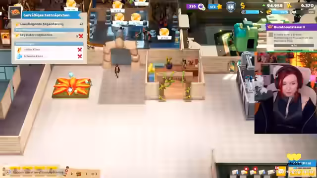 04:44:36Die Streamerin startet mit dem Bau ihres Museums im Spiel Two Point Museum und richtet zunächst einen Souvenir-Shop und eine Attraktion ein. Ein zentrales Ziel ist die Schaffung eines neuen Botanikbereichs, der einen Indoor-Garten beinhaltet. Dies erfordert den Einsatz von speziellen Geräten wie einem Heizkörper und Luftentfeuchter sowie die Einstellung von Personal wie dem Botanikexperten Raffi, um das Projekt voranzutreiben und die Exponate wie eine Venusfliegenfalle zu präsentieren.