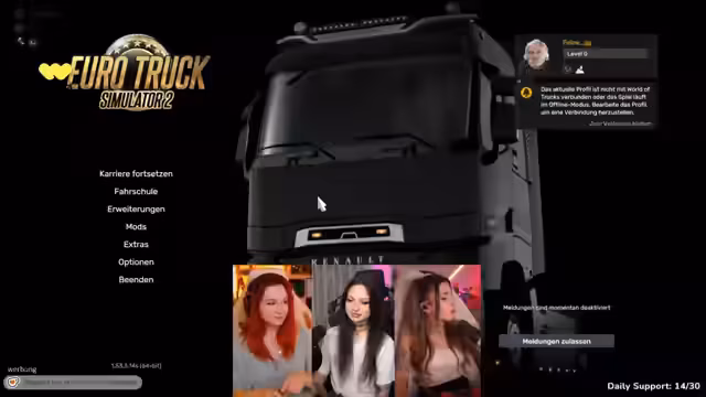 02:27:45Es wird über technische Probleme gesprochen, wie z.B. dass der Streamer als offline angezeigt wird und dass das Spiel beendet werden muss. Es wird die Playlist 'Music that excites white people' gelobt. Es wird erklärt, wo man das Passwort für den Konvoi findet. Es wird überlegt, ob man einen eigenen Truck braucht, um am Konvoi teilzunehmen. Es wird berichtet, dass der Spielstand nicht geladen werden kann, weil er von Mods abhängig ist. Es wird versucht, dem Konvoi beizutreten, was schließlich gelingt. Es wird erwähnt, dass der Hype-Train immer ein Design hat, das wie der ETS-Truck aussieht.