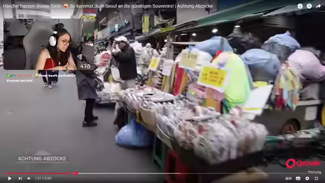 03:28:06Der Streamer schaut eine Folge der Reihe 'Achtung Abzocke', in der es um Preisunterschiede bei Ginseng-Produkten auf südkoreanischen Märkten geht. Es wird der massive Preisaufschlag für Touristen gegenüber einheimischen Kunden thematisiert. Im Anschluss folgt eine Recherche über Souvenirs, bei der sich der Streamer über sinnlose und teure Einkäufe ärgert und empfiehlt, auf echte Sehenswürdigkeiten statt auf abgekartete Touren zu setzen. Es wird diskutiert, dass Touristen in Innenstadtbereichen überhöhte Preise zahlen, während auf Großhandelsmärkten deutlich günstiger eingekauft werden kann. Die Touristenfalle Bustour wird ebenfalls als gescheitertes Experiment bezeichnet.