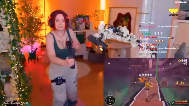 02:07:50Im Gespräch mit der Community wird das Thema Stream-Länge angesprochen. Feli lehnt einen 24-Stunden-Stream ab, da er für sie zu anstrengend ist, aber könnte sich einen 12-Stunden-Stream vorstellen. Gleichzeitig kündigt sie die Inhalte der nächsten Woche an: einen Semi-Horror-Stream mit „Sons of the Forest“, einen kreativen Teppich-Stream und Ringfit. Die Energie im Stream ist hoch, und Feli motiviert die Zuschauer, aktiv zu bleiben, während sie selbst in den Sport vertieft ist und das nächste Spiel anpeilt.