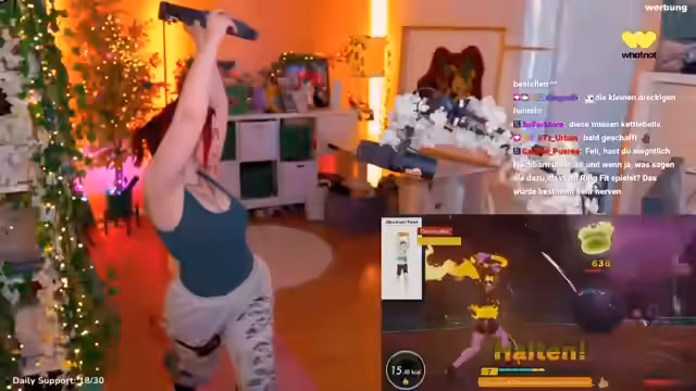 03:05:40Es wird erwähnt, dass ein neues YouTube-Video raus ist. Es wird versucht, ein Viech im Spiel zu besiegen und kommentiert, dass es wahrscheinlich mit einem HP überlebt. Es wird kommentiert, dass man den Untergrund fertig machen möchte, um im nächsten Stream zum Boss zu können. Es wird kommentiert, dass man fast 120 Kalorien im Stream verbraucht hat. Es wird Level 56 erreicht. Es werden Beinheben in die Übungen mit aufgenommen, was als anstrengend empfunden wird. Es werden verschiedene Tränke gemischt, um die Übungen zu verstärken. Es wird kommentiert, dass die Gegner wenig Schwächen haben. Es wird der Überkopfhüpfschwung benutzt, um die Gegner zu besiegen. Es wird kommentiert, dass man bisher nichts von den veganen Sachen bestellt hat. Es wird kommentiert, dass eine Übung weh tut und man das Level noch weitermachen muss.