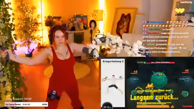 Der Nachmittag bei Feli ist abwechslungsreich: Nach einer Plauderrunde mit der Community folgt ein intensives Ring Fit Adventure, bei dem fleißig Monster besiegt werden. Nach getaner 'Arbeit' wird eine wohlverdiente Sushi-Bestellung aufgegeben und gemeinsam mit dem Chat verspeist. Auch Themen wie soziale Ängste werden angesprochen.