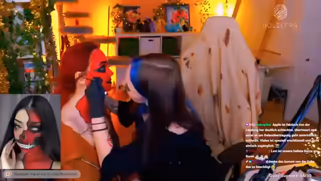 01:58:26Aki und Feli setzen das Bodypainting fort. Es wird über die Herausforderungen gesprochen, rotes Make-up zu entfernen und wie Aki einmal ihre erste Hautschicht abschrubben musste, um ein Tattoo für ein Cosplay zu entfernen. Aki bittet den Chat um Unterstützung für Lara, damit sie keinen Druck verspürt. Feli äußert sich dazu, dass es einfacher ist, sich selbst zu schminken als andere. Es wird über die Schwierigkeit gesprochen, den Mund mit den Zähnen zu schminken, und eine Notlösung mit einem schwarzen Grinsen vorgeschlagen. Der Chat wird nach oben verschoben, damit er besser lesbar ist. Es wird gescherzt über 'Kriegsvermalung' und das Abwischen von Farbe an der Katze Chonk. Es wird über das Färben von Hunden gesprochen, um sie vor Diebstahl zu schützen. Feli erzählt, wie sie versehentlich die Schwanzspitze ihrer Katze blau gefärbt hat. Es wird über das neue Mischpult gesprochen, das von Chonk 'gechonkt' wurde. Feli lobt die Deckkraft der Bodypaint-Farbe und vergleicht sie mit Deadpool.
