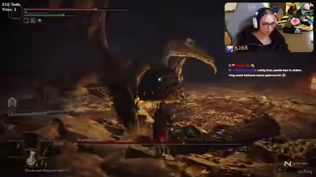 02:16:42Ein intensiver Kampf gegen den Boss Radahn beginnt. Der Streamer hat Schwierigkeiten mit den Attacken des Bosses, der Lava einsetzt und unvorhersehbar agiert. Nach mehreren Versuchen und frustrierenden Momenten gelingt es, den Boss zu besiegen, was eine große Erleichterung und Freude auslöst.