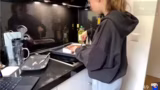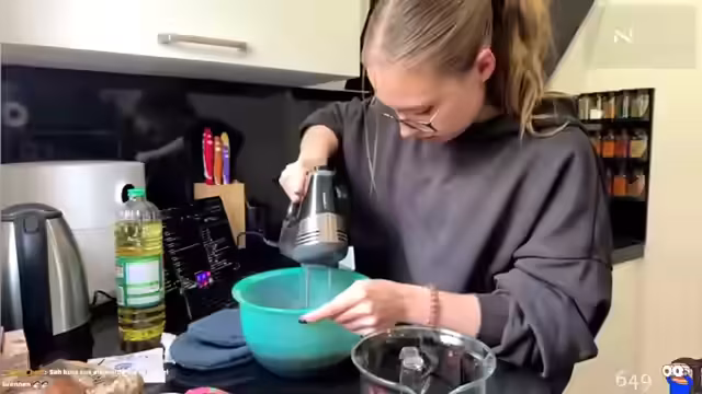 01:34:28Der Fokus liegt nun auf dem Backen von Brownies mit einer Backmischung. Die Streamerin folgt genau der Anleitung auf der Verpackung, um die Form korrekt aufzubauen und den Teig zuzubereiten. Es kommt zu kleinen Problemen beim Aufklappen der Form und beim Auffinden der richtigen Anweisungen. Die Zutaten wie Eier, Wasser und Öl werden abgemessen und mit einem Löffel zu einem glatten Teig verrührt. Der Teig wird anschließend mit Raspelschokolade vermischt und in die Form gefüllt.