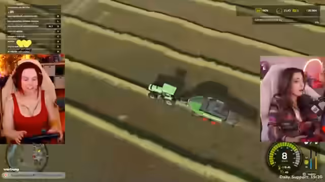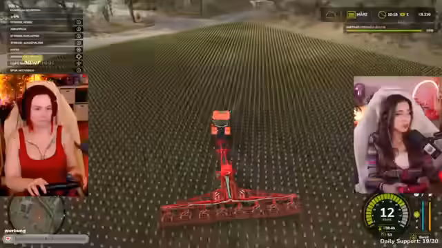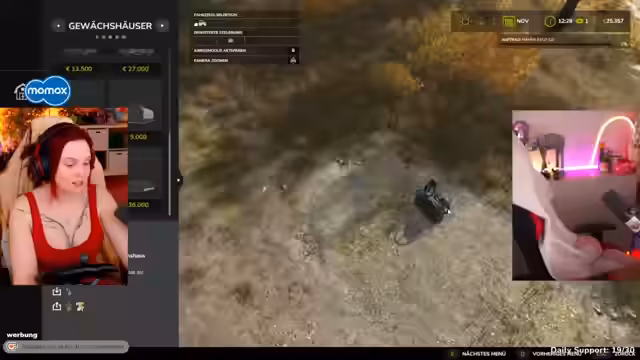 03:05:54Die Streamerin und ihr Gast spielen Farming Simulator und haben bereits 25 Spielstunden erreicht. Es gibt Diskussionen über Kredit aufnehmen, den Kauf von Geräten und die Ernte von Sonnenblumen. Die Streamerin erkundet verschiedene Möglichkeiten, Geld zu verdienen, wie zum Beispiel durch Ölproduktion mit Rapssamen oder den Anbau von Erdbeeren in einem Gewächshaus.