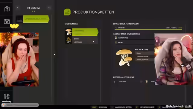 04:13:04Die Streamerin steht vor der Entscheidung, ob sie ein Pilzgewächshaus oder eines für Erdbeeren kaufen soll. Nach Recherche im Chat und im Internet entscheidet sie sich für ein mittleres Pilzgewächshaus für 18.000 Euro. Sie plant, Pilze anzubauen und zu verarbeiten, um zusätzliche Einnahmen zu generieren.