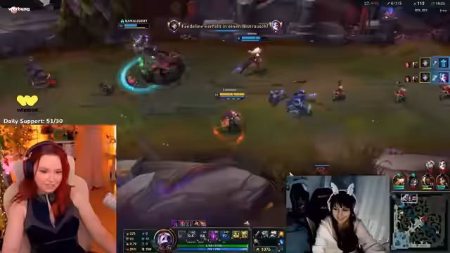02:40:03Es wird eine gemeinsame League of Legends-Session mit Zuschauern angekündigt, wobei der Fokus auf Spaß und Unterhaltung liegt. Es wird über die Rollenverteilung und mögliche Strategien diskutiert, wobei betont wird, dass es sich um ein entspanntes Spiel handelt und nicht um einen ernsthaften Wettkampf. Es wird über frühere Erfahrungen im Spiel gesprochen, insbesondere über das Grinden auf bestimmte Ränge. Es wird über die Bedeutung von Teamwork und die Schuldzuweisung bei Niederlagen gescherzt. Die Teilnehmer tauschen sich über ihre Lieblingscharaktere und -strategien aus und geben sich gegenseitig Tipps. Es wird auch über technische Probleme und die Anpassung der OBS-Szene gesprochen, um die Zuschauer optimal einzubinden. Der Titel des Streams wird als 'E-Girl-Duo-Cure' festgelegt, um Klicks zu generieren. Es wird über die Freundschaftsanfrage im Spiel und die Erwartungen an die gemeinsame Session gescherzt. Es wird betont, dass es nicht schlimm ist, LP zu verlieren, solange alle Spaß haben. Es wird über die Outfits der Teilnehmer gesprochen, insbesondere über ein Kleid, das für einen Maskenball ausgeliehen wurde.