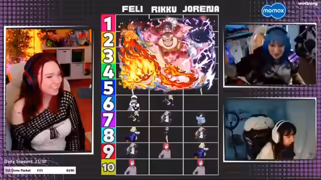 04:19:51Die Diskussion dreht sich um die Platzierung verschiedener Anime-Charaktere in einer persönlichen Rangliste. Feli äußert ihre Besorgnis über die bevorstehenden Enthüllungen ihrer Top-Platzierungen und die potenziellen Charaktere, die sie dort einordnen muss. Es gibt Aufregung und Ungläubigkeit über die Platzierung bestimmter Charaktere, insbesondere Kakashi, und die Angst vor noch schlimmeren Platzierungen. Die Community wird aufgefordert, Screenshots der Liste zu machen, um die umstrittenen Platzierungen festzuhalten. Es wird auch über die Möglichkeit gesprochen, weitere Blind-Rankings mit anderen Themen wie Süßigkeiten oder Spielen durchzuführen, wobei die Zuschauer aufgefordert werden, Themenvorschläge einzureichen. Feli erwähnt, dass sie eine Figur von Marek besitzt, bei der der Oberkörper ausgetauscht werden kann, und dass es auch Figuren von Gojo gibt, bei denen er keine Hose trägt. Es wird vereinbart, nächste Woche weitere Rankings durchzuführen und Themenvorschläge zu sammeln.