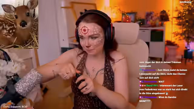 02:39:08Der Streamer beginnt mit dem gruseligen Teil des Halloween-Make-ups: dem 'Loch im Kopf'. Zuerst wird eine Vorzeichnung für das Loch erstellt. Es wird Kunstblut verwendet, um den Effekt zu erzielen, wobei betont wird, dass das Blut sehr dickflüssig ist und hoffentlich nicht abfärbt. Die Idee ist, ein Fadenkreuz mit Blut zu simulieren, um den Look eines 'erschossenen Rentiers' zu vervollständigen. Trotz der gruseligen Elemente wird der Look als 'süß und kreativ' beschrieben. Es wird auch überlegt, ob die Lippen schwarz geschminkt werden sollen, um die 'Schnute' zu betonen, aber die Entscheidung fällt auf 'ohne Schnute'.