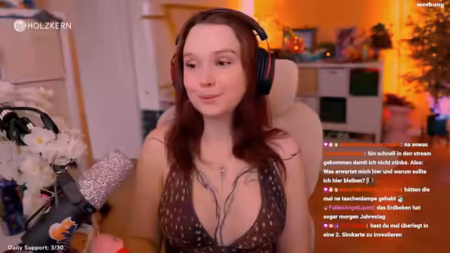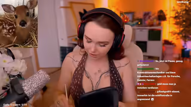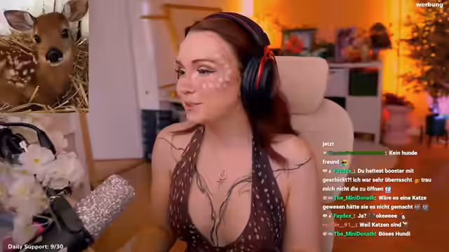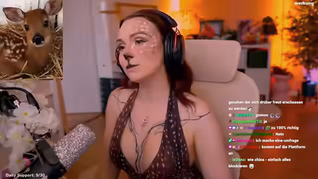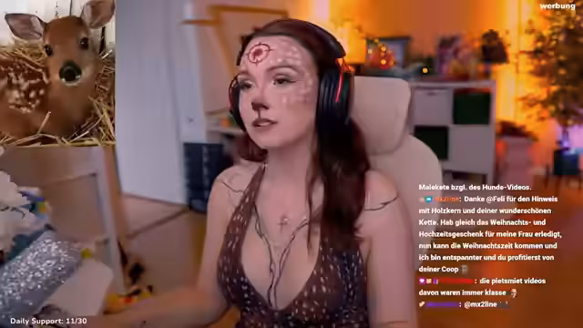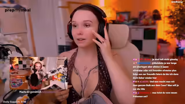 05:55:59Die Streamerin erhält einen unerwarteten Anruf von Helen, einer anderen Streamerin, die im Rahmen einer Bestrafung bei ihr anklopfen muss. Helen ist als Fliege verkleidet, während die Streamerin als „Bambis Mom“ (ein erschossenes Reh) auftritt und ihre Katze Chonk als Halloween-Deko präsentiert. Helen erklärt, dass sie Pizza backen und eine Halloween-Pizza mit Geistern, Totenköpfen und Spinnenmotiven zubereiten wird. Die Streamerin spielt weiterhin The Walking Dead von Telltale und erwähnt, dass sie später Re-Animal spielen möchte, eine Demo von den Little Nightmares-Entwicklern. Es wird über einen Kostümwettbewerb gesprochen, den die Streamerin gewinnen möchte, und sie überlegt, wie sie ihr Kostüm noch gruseliger gestalten kann. Helen erwähnt, dass sie auch bei Contra angeklopft hat, der im Made-Outfit war. Die Streamerin und Helen verabschieden sich, und die Streamerin kehrt zu ihrem Horrorspiel zurück, wobei sie sich über Helens „Loser“-Schild auf der Stirn amüsiert.