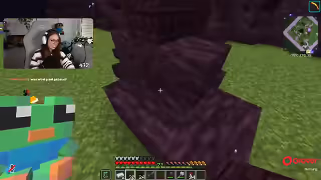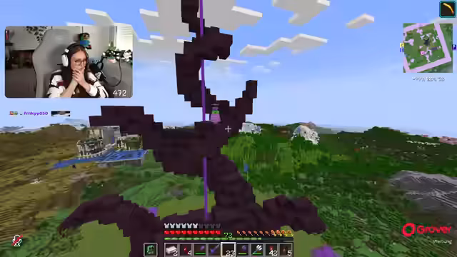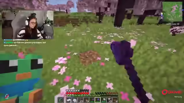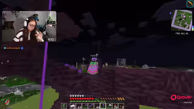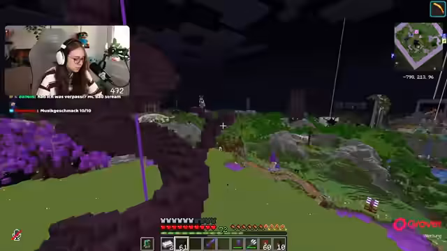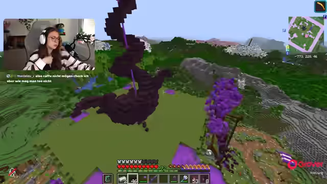 05:10:13Mit den gesammelten Ressourcen wird der Bau für das Endgame begonnen. Die Streamerin experimentiert mit der Platzierung der Chorusfrüchte und überlegt, ob eine vertikale Anordnung mit Blazerods von beiden Seiten gut aussehen würde. Gleichzeitig treten Server-Probleme auf, da der Server voll ist und die Verbindung instabil wird, was den Fortschritt verzögert.
