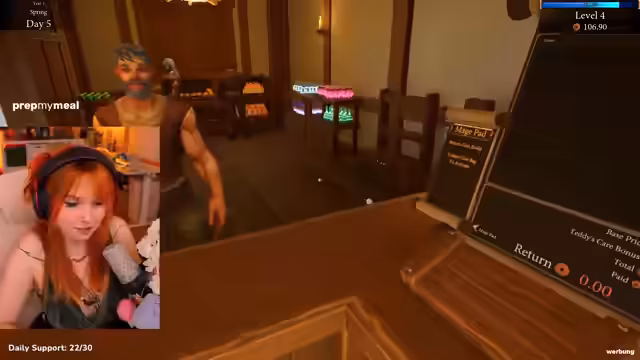 05:39:22Nachdem der Streamer den ersten Tag erfolgreich hinter sich gebracht hat, schließt er seinen Shop für den Tag. Er hat über 200 Gulden verdient und plant für den nächsten Tag. Er entdeckt die Möglichkeit, neue Produkte wie Tränke herzustellen und zu verkaufen, und erwirbt eine Lizenz für neue magische Items. Der Streamer versucht, Preise für neue Produkte wie Potion of Stamina und Zwiebeln zu finden, die für die Kunden attraktiv sind.