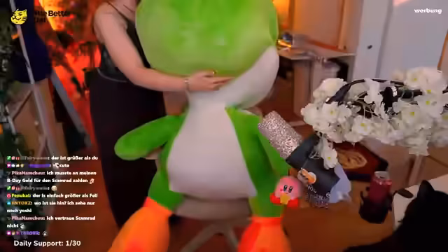 01:13:14Zu Beginn des Streamteils berichtet der Streamer vom Gewinn eines riesigen Yoshi auf der Dippemess, den Timo im ersten Versuch durch präzises Drücken eines Buttons gewonnen hat. Der Yoshi wird als riesig beschrieben, so groß wie der Streamer selbst, und es gibt Diskussionen über die genaue Beschaffenheit von Yoshis (ob Panzer oder Sattel). Dies führt zu einem unerwarteten Themawechsel zu Yoshis als Videocharakter.