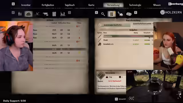 01:32:55Nach dem Einstieg ins Spiel standen die grundlegenden Überlebens- und Dorfmanagement-Aufgaben im Fokus. Dazu gehörte der Verkauf von überflüssigen Gegenständen wie Alkohol und die Sicherstellung der Nahrungsmittelversorgung durch Jagd. Es wurde die Zielsetzung des Spiels erläutert, Nachkommen zu zeugen, um bei Tod im Spiel als Kind wiederzuerstehen und das Dorf weiter aufzubauen. Die Verwaltung der Dorfbewohner, die Ernährung und die Bewältigung von Quests waren zentrale Themen.