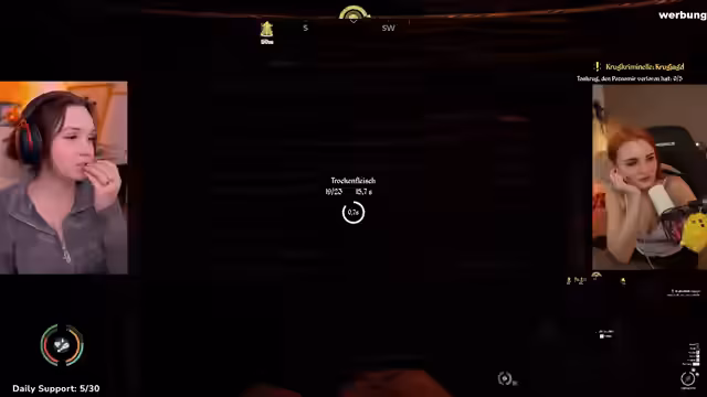 03:17:22Feli sucht erfolglos nach Ruinen, um weitere Ressourcen und Gulden zu finden. Sie erwähnt, dass sie Punkte für ein Event sammeln muss, aber mit 136 von 10.000 Punkten weit entfernt ist. Parallel bereitet sie sich auf einen bevorstehenden Stream mit Derwan vor, der für die Ramla-Quest notwendig ist. Feli kritisiert die schwierige Lage der Siedlung ohne Ruinen und drückt Frustration über die mangelnde Beute aus, während sie sich auf die Rückkehr nach Hause vorbereitet, um die Nacht zu überspringen.