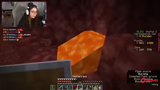 00:17:32Nach dem Betreten des Nethers geht es direkt auf die Suche nach einem End-Portal. Der Spawn ist jedoch gefährlich und nahe der Lava, was den Streamer dazu veranlasst, umgehend den Standort zu wechseln. Auf der Flucht entdeckt er eine sogenannte üppige Höhle (Lush Cave), die sich als ein Hotspot für seltene Ressourcen wie Axolotle und Kupfer herausstellt. Die Höhle bietet jedoch auch gefährliche Mobs wie Baby-Zombies, was die Sammlung erschwert.