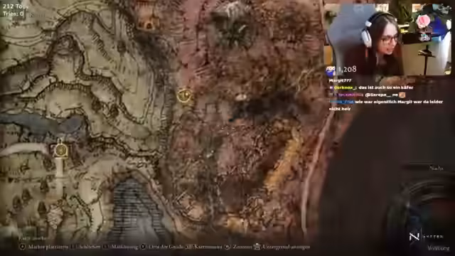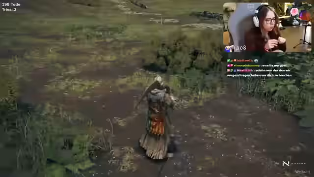 00:30:40Die Hauptaktion des Streams konzentriert sich auf die Suche nach Dunkelschmiedesteinen. Nach anfänglicher Verwirrung über den Kaufort, finden die Zuschauer heraus, dass man sie in den königlichen Ruinen im Westen kaufen kann. Der Streamer reitet dorthin, muss aber auf dem Weg Bosskämpfe gegen einen Gegner mit Feuerbällen und einen weiteren namens Blaetter führen. Diese Kämpfe verlaufen chaotisch und verursachen beim Streamer großen Frust, da er Schwierigkeiten hat, die Angriffe des Bosses auszuweichen und gierig wird.