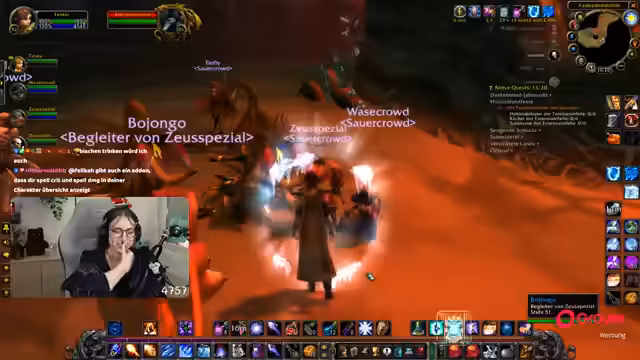 12:04:18 Wen sollte man davon am besten schieben? Vermutlich die gute Dame hier? Oder den Warlock? Warte, meinst du... Ach, du meinst von denen hier, von den Allianztypes. Ja, genau. Einfach die, die heilt, oder? Ja. Okay, das ist heftig, ne? Heilst du mich? Ja, ich heil dich. Was? Ich habe kein Ziel. Ich bin noch ein... Jetzt kommt der Boss hier. ...den Mage, der auf mich geht. Ähm... Ich weiß nicht, wo du gerade stehst. Jetzt komm. Ich heil dich. Ja, gut.