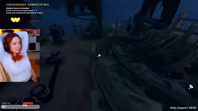 04:36:29Die Streamerin findet einen Seekraskorb und schmutziges Wasser. Sie entdeckt einen Ort, an dem sie scheinbar aufgeladen werden kann, und findet ein Ruder. Sie entdeckt verlorenes Segelwissen (1 von 4). Währenddessen erhält sie einen Anruf von O2 bezüglich ihres Handyvertrags, den sie aufgrund des schlechten Empfangs kündigen möchte. Sie erzählt, dass sie ein Arbeits- und ein Privathandy hat und das Arbeitshandy für IRL-Streams benötigt. Sie erkundet weiter und fällt fast herunter. Sie findet einen Schlüssel direkt neben der Tür, wo er angeblich verloren war. Sie findet ein neues Fresco, das Ackerbau, Inselabbau und Farming zeigt. Sie findet ein Steuerrad und zwei Anker auf der Insel. Sie äußert den Wunsch, Hausflipper zu spielen. Sie findet einen Marinenkäfer und betritt einen Turm, in dem sie eine Wendeltreppe hinaufsteigt. Sie erreicht einen Leuchtturm und findet ein Buch.