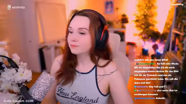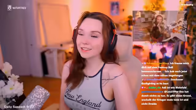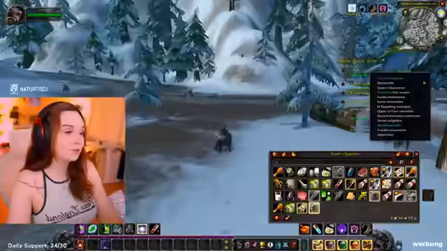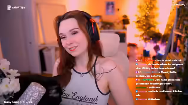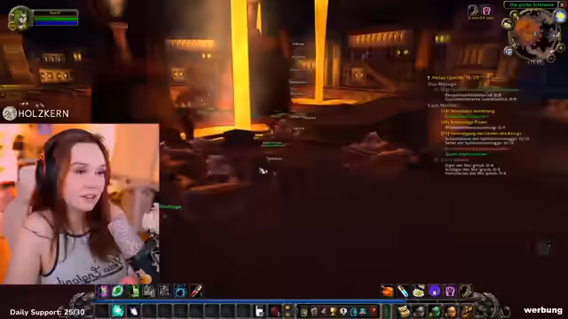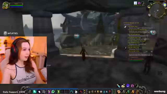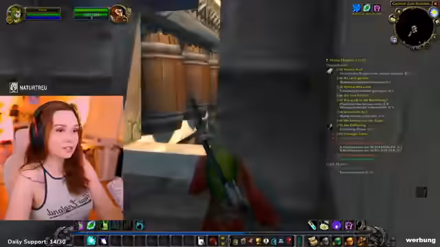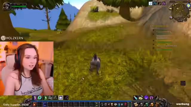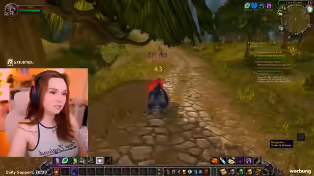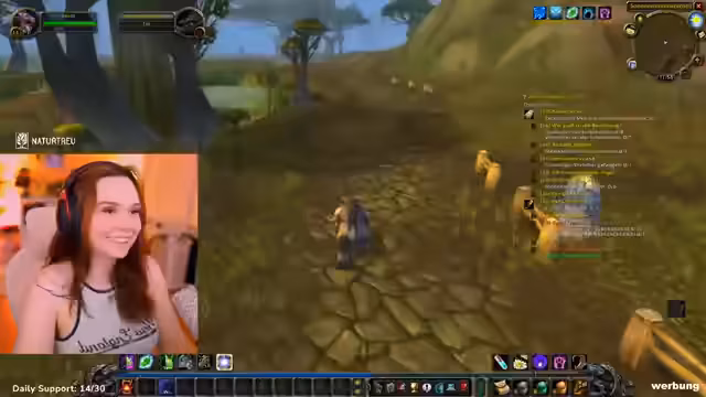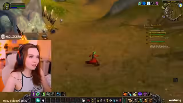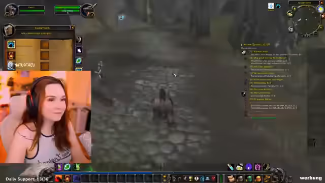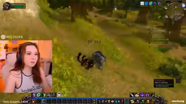 03:26:08Feli farmt in den Anfängen des Streams Quest-Gegenstände wie Bärenfleisch, Spinnensekret und Ebergedärme. Sie übt ihre Kampfkombination aus Zorn, Zorn, Mondfeuer und Bärenform, während sie ihr Ziel bespricht, Level 20 für die Katzenform zu erreichen. Dabei erwähnt sie auch eine gefährliche Wanderung durch Gebiete mit Krokodilen und Orks, die sie als 'crazy' beschreibt und die sie mit anderen Spielern erlebt hat.