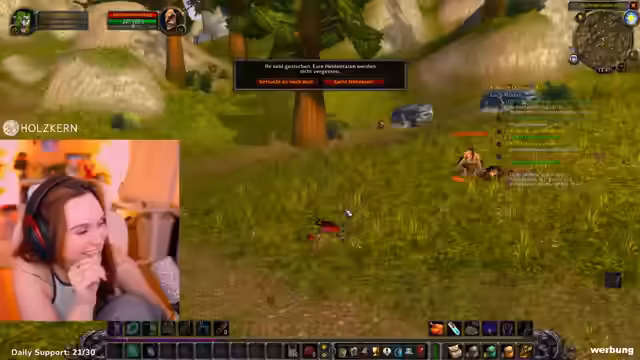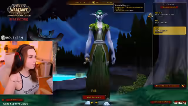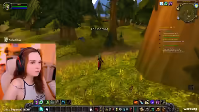 05:07:47Nach Abschluss des Transfers kehrt der Charakter auf Realm Thunderstrike zurück. Die Streamerin fliegt zur Leiche, vermeidet aber den direkten Respawn in der Gefahrenzone. Sie nutzt die Zeit, um Quests abzuschließen, Buffs an andere Spieler zu verteilen und Kampfrotationen (Zorn, Mondfeuer, Bärenform) zu üben. Dabei thematisiert sie PvP-Gefahren durch unbedachtes Buffen und lernt aus weiteren Begegnungen.