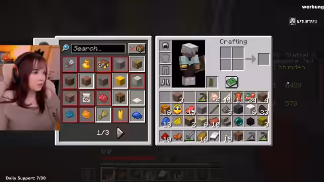 07:09:20Der Stream konzentriert sich auf das Erreichen von Minecraft-Achievements. Es wird der Versuch unternommen, Notenblöcke herzustellen, indem man Redstone und Holz craftet. Es kommt zu technischen Diskussionen über die englische Bezeichnung "Notenblock". Auch wird ein Hebel platziert und eine automatisierte Redstone-Truhe entdeckt, was weitere Erfolge verspricht. Der Fortschritt der Achievements wird als zentraler Spielmechanismus verfolgt.