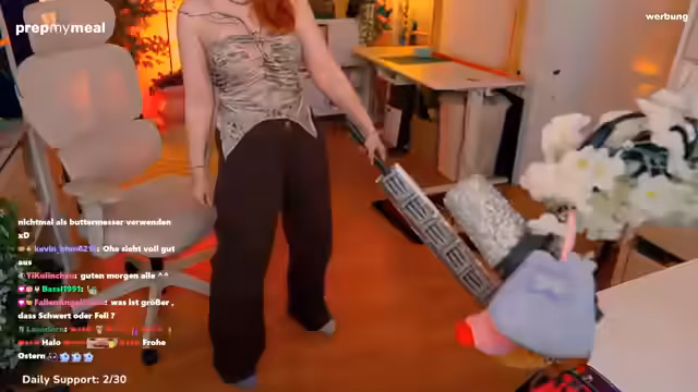 00:15:24Das Gewinnspiel wird offiziell gestartet. Die Aufgabe der Zuschauer besteht darin, die Anzahl der ins Stream gehaltenen Ostereier zu zählen und die korrekte Zahl über einen Bot einzusenden. Eine zufällige Person, die die richtige Anzahl angibt, gewinnt eine 50-Euro-Karte. Dies ist die zentrale interaktive Aktion für den Stream.