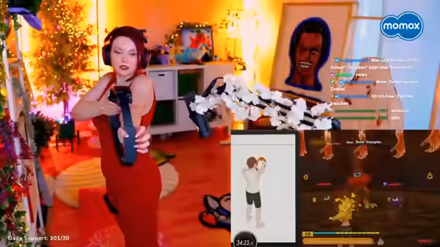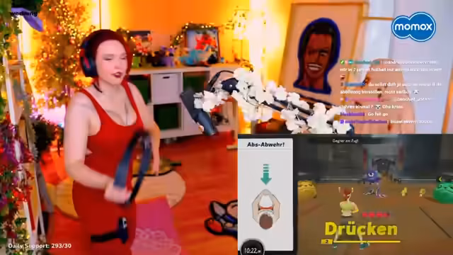 01:22:41Die Streamerin beendet das Beauty-Thema und macht sich bereit für den Sport. Sie unterstreicht noch einmal, dass ihr Stream eine erwachsene Zone sei, in der sie sich vor allem durch Gaming und Kosplay unterhalte. Abschließend beginnt sie mit Ring Fit Adventure, wobei sie den Game-Sound etwas leiser stellt. Sie ist motiviert und findet den Spaß an der gamifizierten Form des Trainings, da diese sie anscheinend zum Sport treibt.