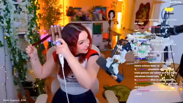 00:19:02Die Streamerin nutzt den Stream, um eine spontane Haarveränderung vorzunehmen. Sie nimmt einen Lockenstab zur Hand, um Wellen in ihre Haare zu machen, da sie Lust auf eine Veränderung hat. Sie findet ihren Hitzeschutz nicht und versucht es daher auf niedriger Stufe, betont aber die Wichtigkeit von Hitzeschutz für die Haargesundheit. Während des Stylings zeigt sie ihre Haarstruktur und diskutiert im Chat über die Vor- und Nachteile von glatten, welligen und lockigen Haaren und überlegt, ob sie ihre Haare wieder aufhellen soll.