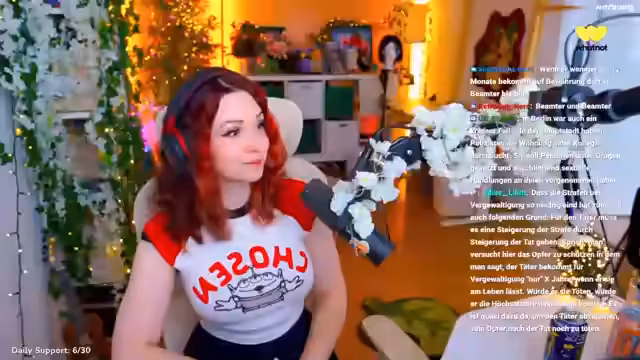 00:29:22Ein zentrales Thema des Streams ist die Kritik an gesellschaftlichen Schönheitsstandards. Die Streamerin diskutiert den Druck, jung auszusehen, und erwähnt, dass über das Nachdenken über kosmetische Eingriffe wie Botox oder Filler nachgedacht wurde, sie sich aber dagegen entschieden hat. Sie betont die Wichtigkeit, selbst der wichtigste Mensch im eigenen Leben zu sein und nicht zu viel für andere zu opfern. Sie spricht offen über ihre eigene Unsicherheit und Selbstkritik, insbesondere im Hinblick auf ihre hohe Stirn, und wie sie diese mit ihrer Frisur kaschiert.