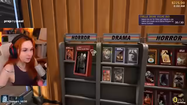 04:32:14Der Stream beginnt mit der Eröffnung einer eigenen Videothek in einem Retro-Simulator. Zunächst wird die Inneneinrichtung gestaltet, wobei ein Katalog zur Bestellung von Filmen und drei Regale für die Ausstellung genutzt werden. Nach dem Aufstellen der Regale werden die Wände und der Fußboden mit verschiedenen Designs, wie Holzwänden oder einer 'Groovy-Tapete', individualisiert, um eine entspannte Atmosphäre zu schaffen. Die Einrichtung wird als 'Feli's Corner' betitelt und der Laden wird als geöffnet markiert, um den Geschäftsbetrieb aufzunehmen.