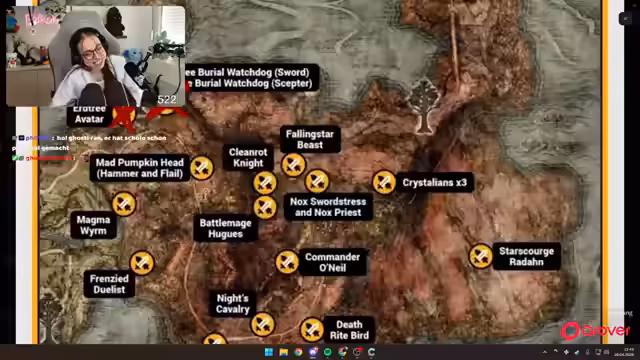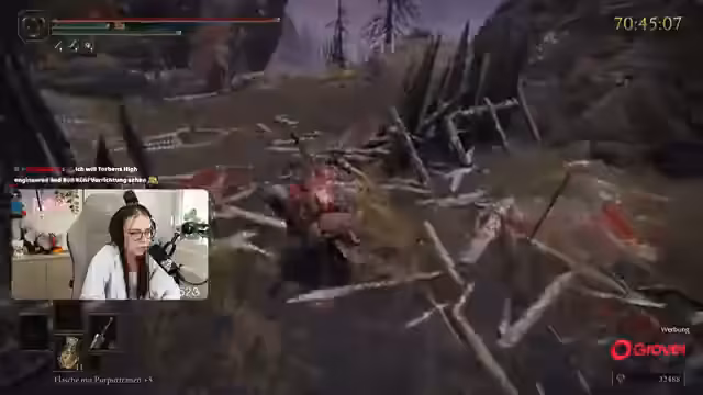 01:24:34Streamer kämpft gegen einen schweren Boss namens Radahn und hat Schwierigkeiten, seine Bewegungen zu预测. Er erklärt die Mechaniken des Bosskampfs und seine Taktik, um ihn besiegen zu können. Gleichzeitig erwähnt er technische Probleme mit dem Controller, der Stick-Drift hat und die Kamera unkontrolliert nach oben bewegt. Trotz dieser Herausforderungen bleibt er motiviert und versucht, den Boss zu bezwingen, auch wenn er dabei mehrmals stirbt.