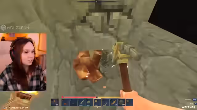 05:04:46Die Spieler wagen sich tiefer in eine Höhle vor, um Kupfer und andere Rohstoffe abbauen zu Dabei werden sie von verschiedenen Monstern wie Ratten, Wölfen und einem Affen angegriffen. Die Streamerin wirkt schreckhaft und erschrocken über die plötzlichen Angriffe und die bedrohliche Atmosphäre in den dunklen Gängen, was zu lauten Schreien und Panikreaktionen führt.